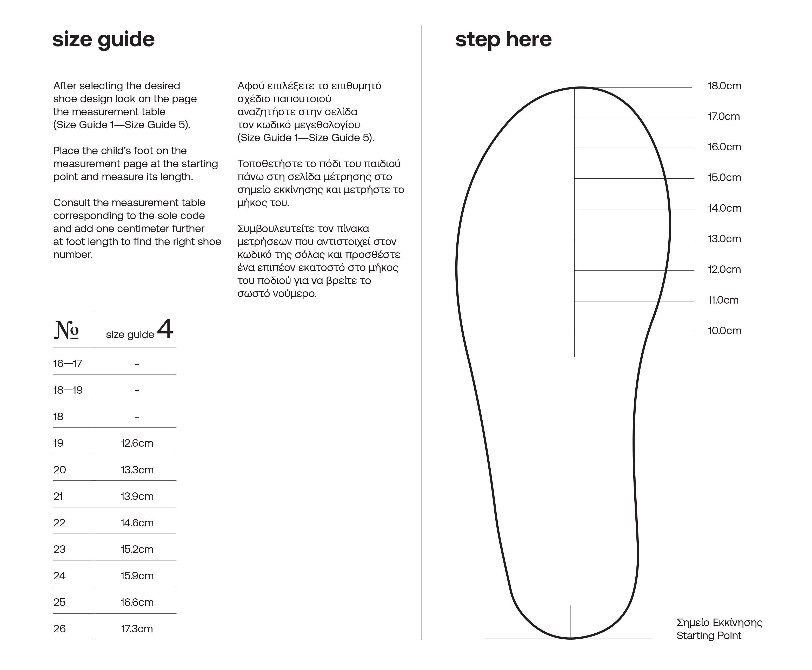 -Για να βρείτε το σωστό νούμερο, στο μήκος του ποδιού θα πρέπει να προσθέσετε επιπλέον 1 εκατοστό ( απαραίτητο άνοιγμα για ευρυχωρία και μελλοντική ανάπτυξη)