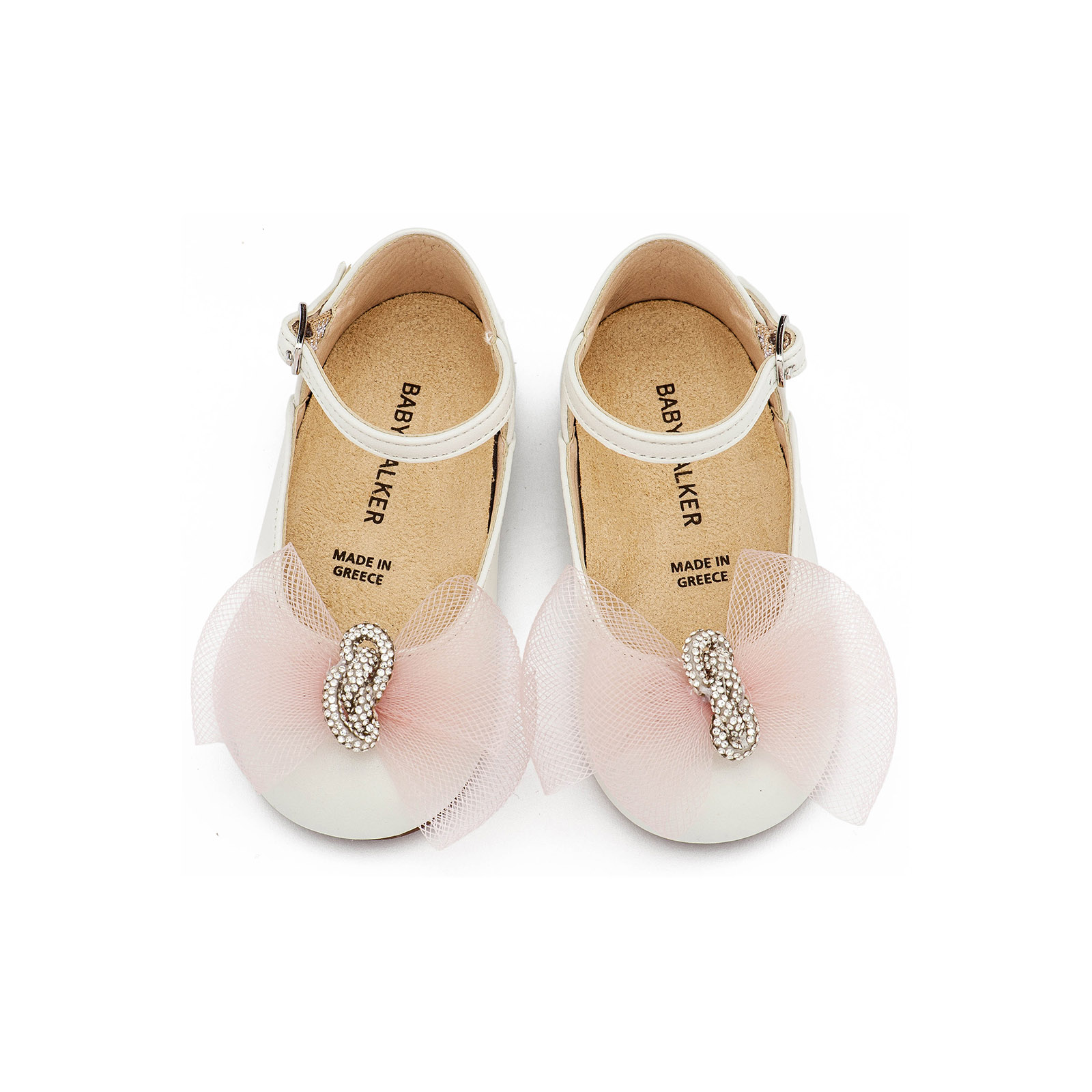 Δερμάτινο Γαλλικό Γοβάκι, με Χειροποιητο Φιόγκο Κρένα και Στρας σε Εκρού Ροζ Χρώμα της εταιρείας Babywalker.