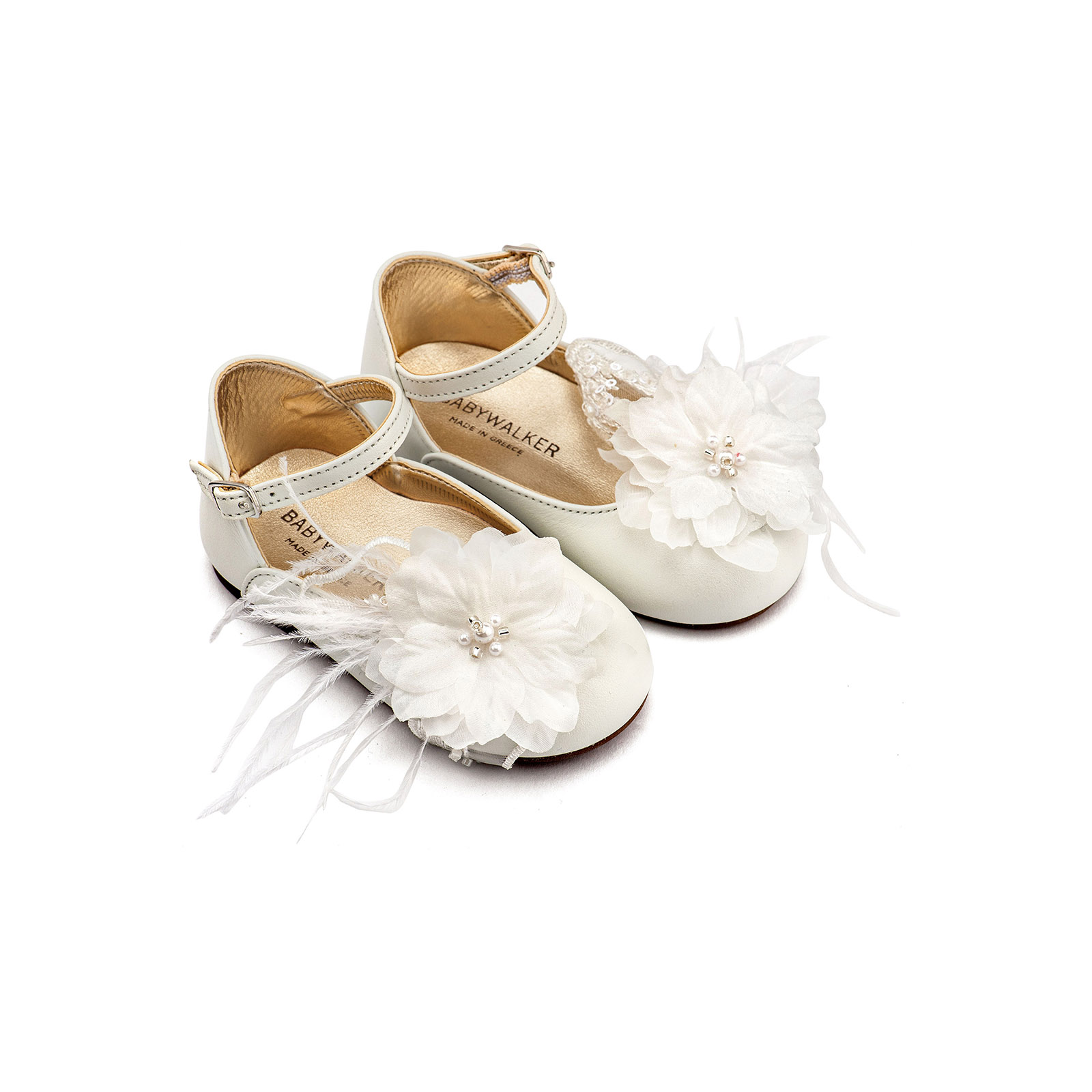 Δερμάτινο Γαλλικό Γοβάκι, με Χειροποίητο Chiffon Λουλούδι και Πούπουλα σε Εκρού Χρώμα της εταιρείας Babywalker.