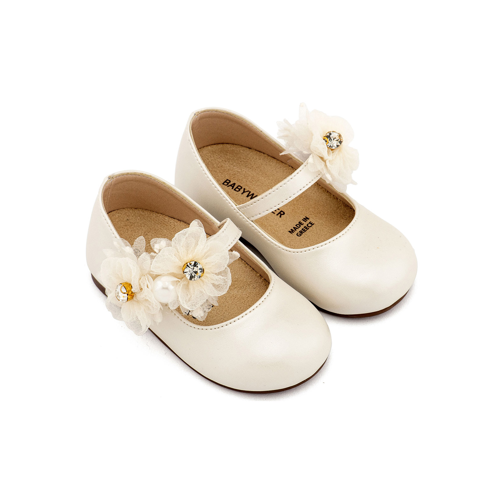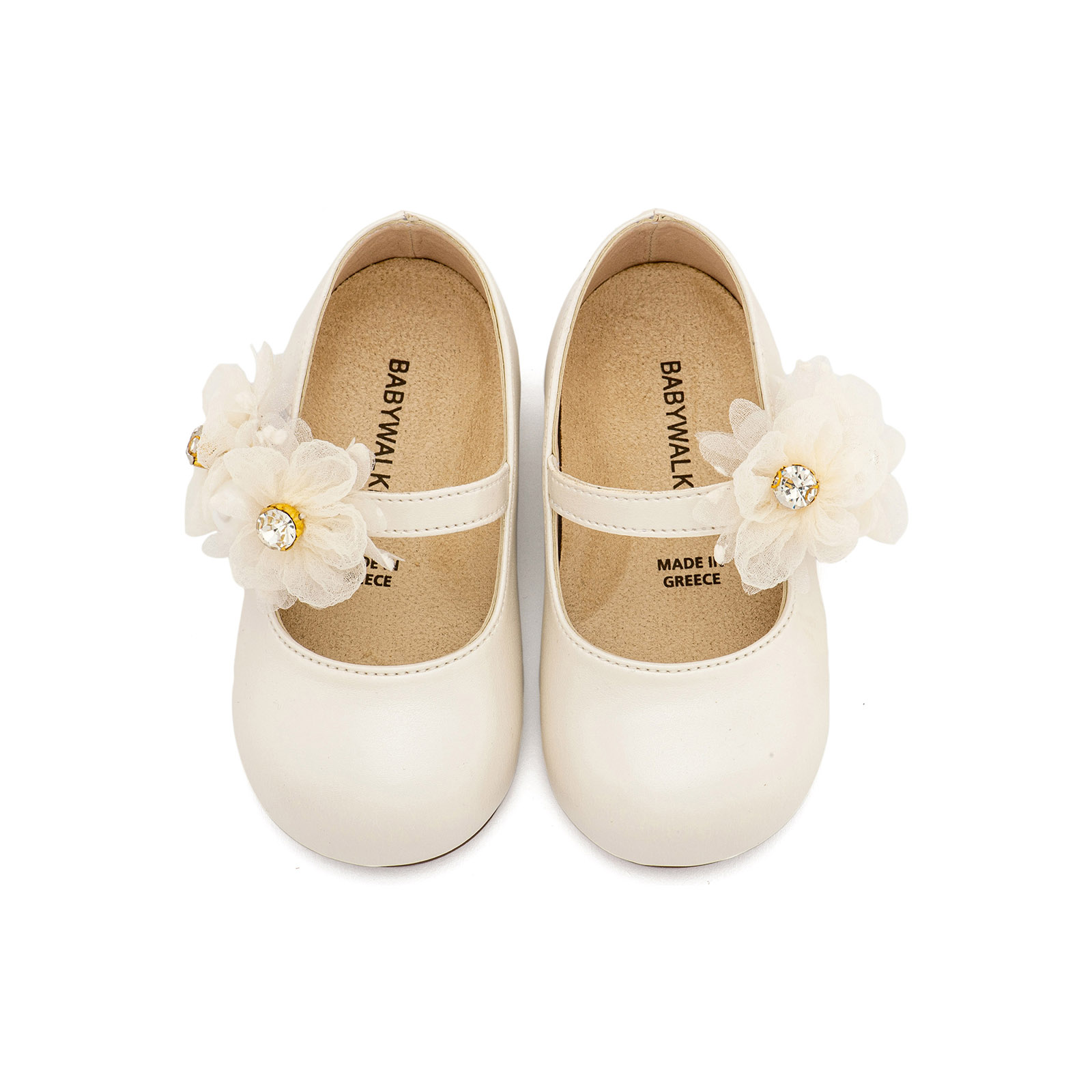 Γοβάκι απο Συνθετικό Δέρμα Μονή Μπαρέτα με Διακοσμητικό απο Λουλούδια Οργάντζας σε Εκρού Χρώμα, της εταιρείας Babywalker.