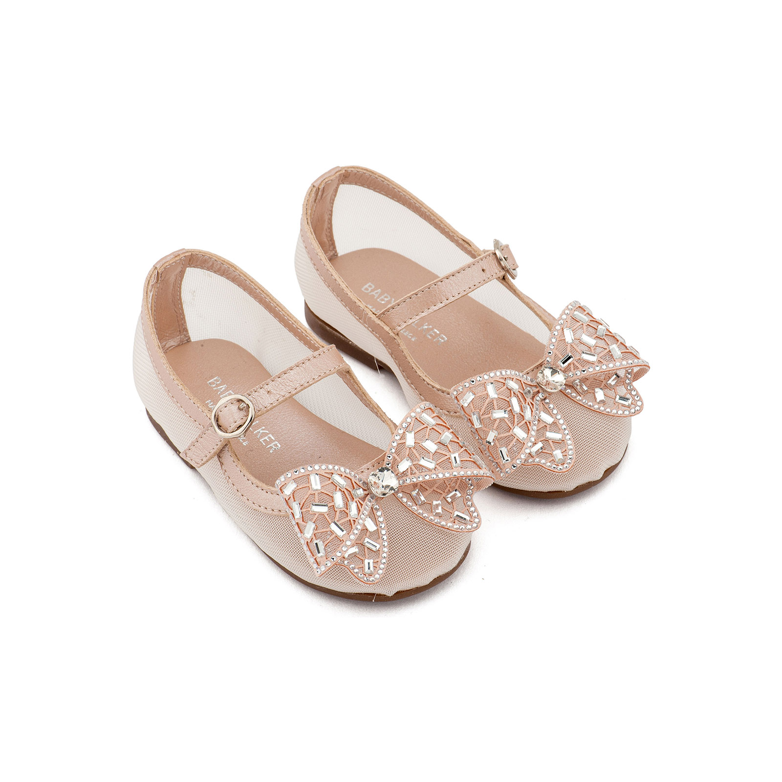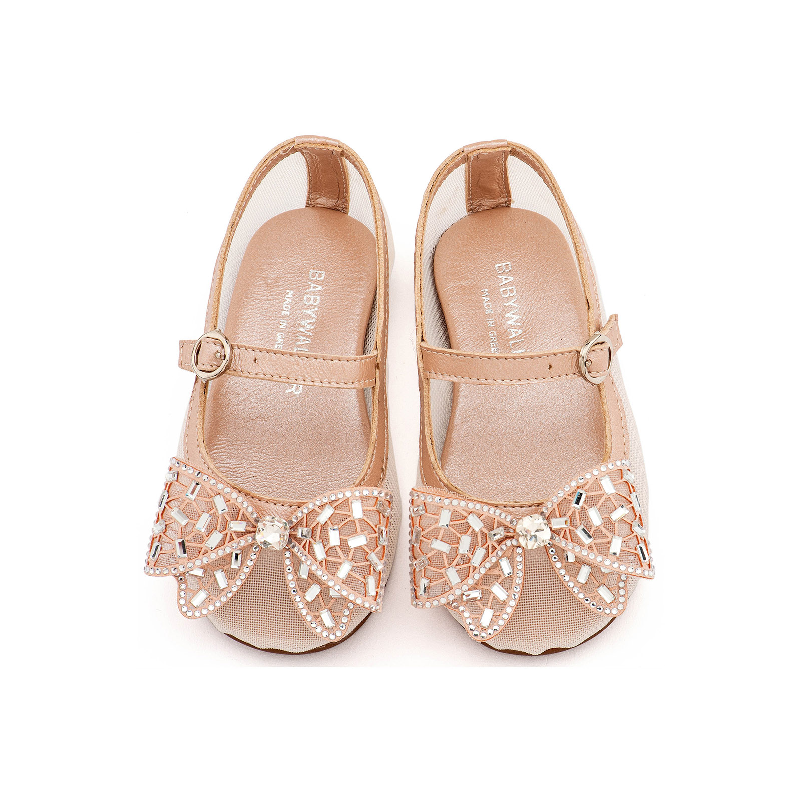 Γοβάκι απο Ύφασμα Φιλντιρέ, με Δερμάτινες Λεπτομέρειες και Φιόγκο Στρας σε Ροζ Αντικέ Χρώμα της εταιρείας Babywalker.