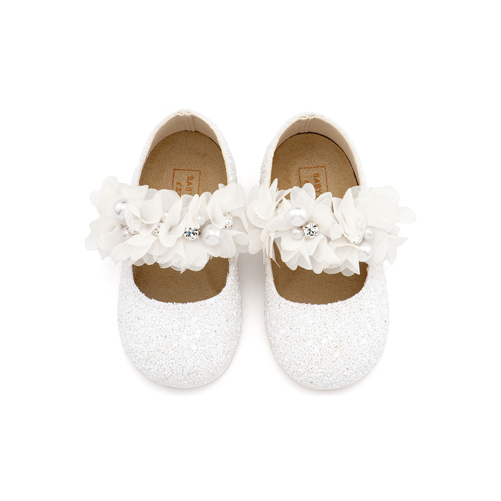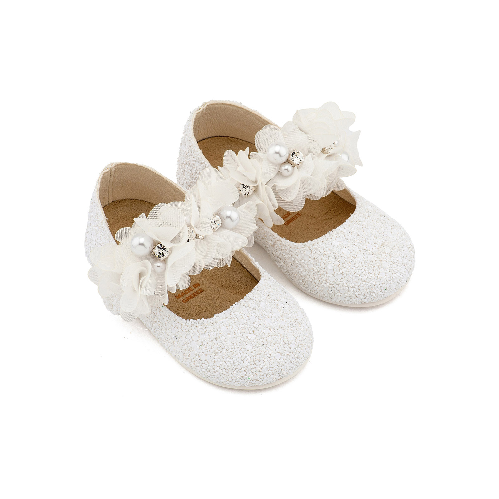 Υφασμάτινο Glitter Γοβάκι με Μονή Μπαρέτα, Στρας με Λουλούδια και Πέρλες, Κρύσταλα Swarovski, σε Λευκό Χρώμα της εταιρείας Babywalker.
