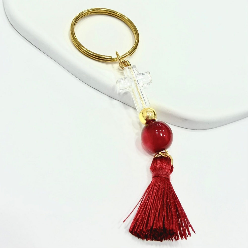 Μαρτυρικό Μπρελόκ με διάφανο σταυρό, χάντρες και φούντα μπορντό