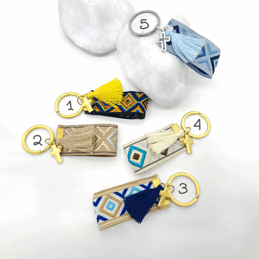 Μαρτυρικό μπρελόκ με πολύχρωμες κορδέλες ,φουντάκια και σταυρό.