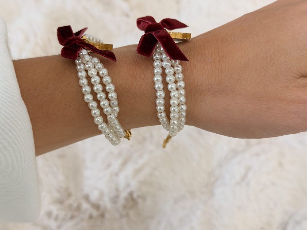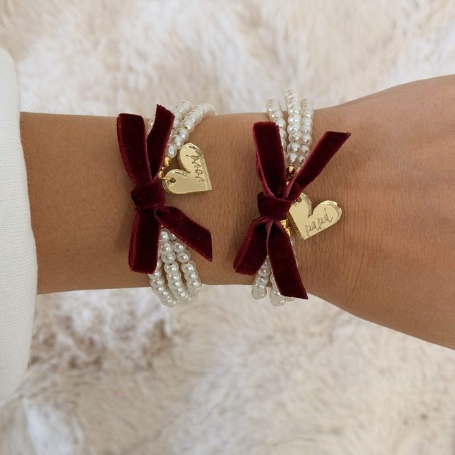 Βραχιολάκι με πέρλες,μπορντώ φιογκάκι,μοτιφ 26  και μοτιφ μαμά,νονά και γιαγιά σε πλεξιγκλας χρυσή καρδιά.Το γιαγιά βγαίνει σε πιο στρογγυλεμένη καρδιά.