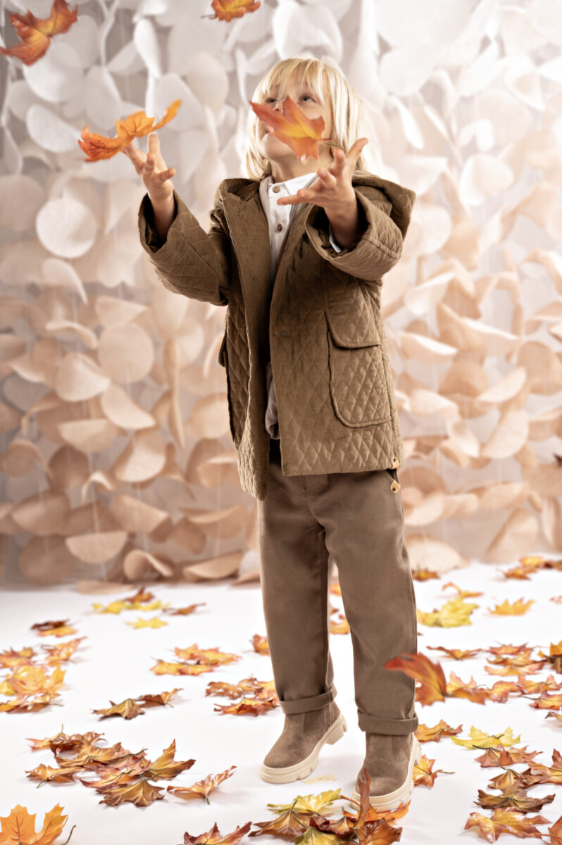 Το κοτλέ καπιτονέ ημίπαλτο σε εξίσου καφέ χρώμα, με κουκούλα, εξωτερικές τσέπες και σατέν καπιτονέ φόδρα, προσθέτει στο σύνολο μια παιχνιδιάρικη και casual αίσθηση.